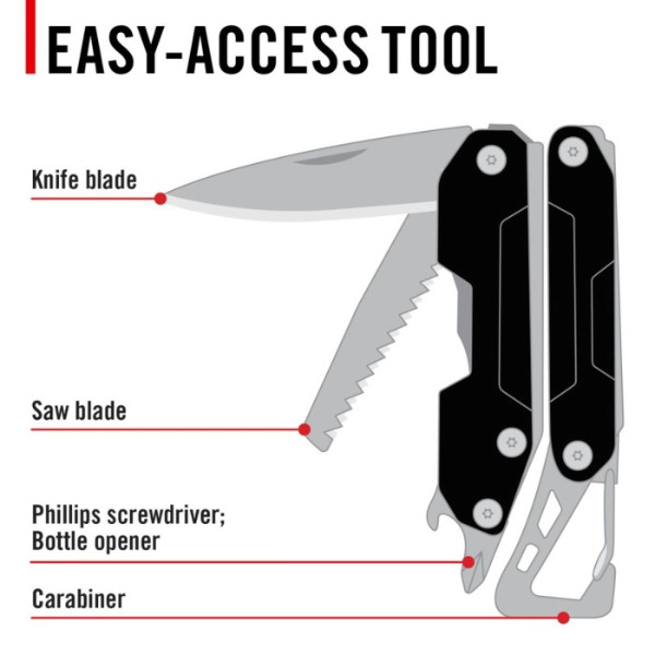 This practical and tactile multi-tool is perfectly pocket-sized, and combines a stainless steel blade, saw, bottle opener, and screwdriver, with a handy built-in carabiner so you can clip it wherever you need it.
