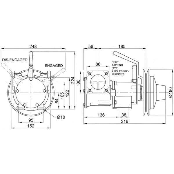Jabsco 51270-0011 Manual Clutched Bilge Pump - Bronze - Single A/B Pulley - 2in Flanged PortsJabsco manual flange mounted clutched pump for bilge and deckwash applications. The Jabsco clutched pump has 2" flanged ports and is capable of pumping 267 litres per minute (59 gallons) at 3 metres total head.