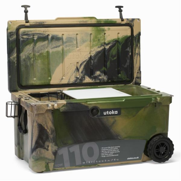 Utoka 110 Tow Cool Box - 104L - CamoThe Beast – The tow110 is our largest cooler, with an impressive 150 can capacity. Large enough to hold your food and drink for 5 days, mobile enough to get around due to the heavy-duty wheels. The cooler can be split for different uses using the Chopping Board divider. The Beast also has space to seat two and can be used as a table! A must have for Outdoor Caterers, Sports & Events Teams.