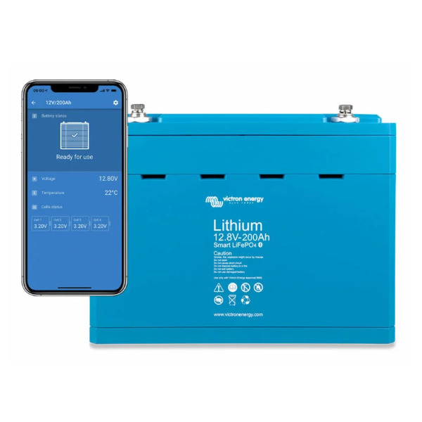 Victron Energy LifePO4 Smart Lithium Battery - 12.8V/200AhVictron Energy Lithium Battery Smart batteries are Lithium Iron Phosphate (LiFePO4) batteries and are available in 12.8 V or 25.6 V in various capacities. They can be connected in series, parallel and series/parallel so that a battery bank can be built for system voltages of 12 V, 24 V or 48 V. The maximum number of batteries in one system is 20, which results in a maximum energy storage of 84 kWh in a 12 V system and up to 102 kWh in a 24 V1) and 48 V1) system. A single LFP cell has a nominal voltage of 3.2 V. A 12.8 V battery consists of 4 cells connected in series and a 25.6 V battery consists of 8 cells connected in series. Why lithium-iron-phosphate?